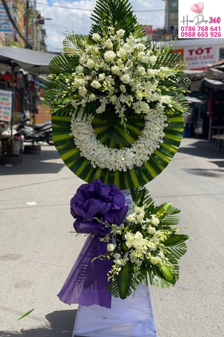 Có thể chọn vòng hoa chia buồn hai tầng hoặc vòng tròn cỡ lớn, tông trắng – tím, trắng – xanh, thể hiện sự tiếc thương sâu sắc.