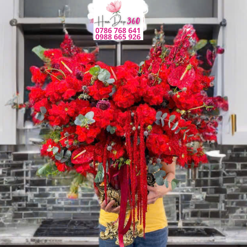 Bình hoa đỏ nổi bật với tông màu đỏ rực rỡ, sang trọng và đầy sức sống, được thiết kế tinh tế từ các loại hoa hồng đỏ, hoa cẩm chướng, lá bạc hà và hoa điểm nhấn độc đáo. Từng cành hoa được cắm thủ công tỉ mỉ, tạo nên một tổng thể cân đối, phù hợp cho nhiều mục đích khác nhau: