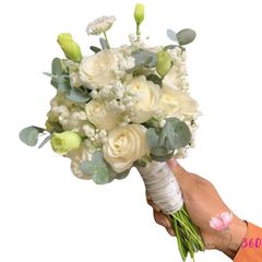 Bó hoa cưới "Trắng Tinh Khôi" Ping trắng mang lại cảm giác dịmang đến vẻ đẹp tinh tế và thanh lịch với sự kết hợp hoàn hảo của những loài hoa trắng thuần khiết. Hoa hồng trắng, biểu tượng của tình yêu trong sáng và vĩnh cửu, làm trung tâm của bó hoa. u dàng, nhẹ nhàng, trong khi Lan tường trắng và Baby trắng tạo thêm sự mềm mại và thanh thoát. Lá bạc làm điểm nhấn tự nhiên, tăng thêm sự nổi bật cho tổng thể bó hoa. Đây là bó hoa lý tưởng cho các sự kiện trang trọng, đặc biệt là lễ cưới, với thông điệp về tình yêu vĩnh cửu và thuần khiết.