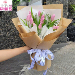 Một bó hoa tulip hồng pastel nhỏ gọn với thiết kế tối giản, giấy kraft nâu vintage và giấy trắng trong sang trọng, kèm nơ ruy băng trắng tinh tế. Mẫu hoa mang phong cách châu Âu hiện đại, cực kỳ thích hợp làm quà tặng sinh nhật, kỷ niệm, lễ tình nhân hoặc ngày Phụ Nữ Việt Nam.