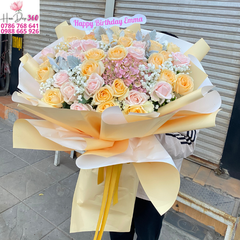 Một bó hoa pastel vàng kem – hồng nhạt phối cùng hoa baby trắng, cẩm tú cầu hồng và lá bạc dusty miller mang đến vẻ đẹp sang trọng và tinh tế. Giấy gói vàng kem cao cấp cùng nơ vàng nổi bật càng làm cho bó hoa trở nên đẳng cấp, xứng đáng là món quà đặc biệt cho sinh nhật, kỷ niệm hay các dịp quan trọng.