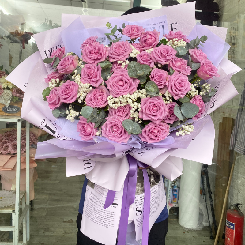 Hoa hồng tím từ lâu đã tượng trưng cho tình yêu thủy chung, sự say đắm và quyến rũ. Một bó hoa hồng tím pastel mix baby trắng và lá eucalyptus, gói giấy tím nhạt thanh lịch, sẽ là món quà tuyệt vời để bạn gửi gắm yêu thương trong dịp sinh nhật, kỷ niệm hay lễ tình nhân.