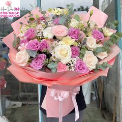 Một bó hoa pastel mix cao cấp gồm nhiều sắc hoa hài hòa: hồng kem tinh khôi, hồng phấn ngọt ngào, hồng tím lilac sang trọng, kết hợp baby trắng và cúc vàng nhạt điểm xuyết. Tất cả được bao bọc trong lớp giấy pastel hồng nhẹ nhàng, nơ hồng bản lớn tạo điểm nhấn.
