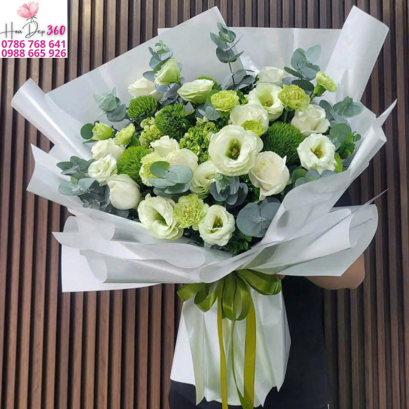 Bó hoa trắng xanh mang phong cách hiện đại, tối giản nhưng vô cùng sang trọng. Sắc trắng tinh khôi của hoa hồng và hoa cát tường tượng trưng cho sự thuần khiết, trong sáng; sắc xanh của hoa cúc và lá phụ lại gợi sự may mắn, khởi đầu mới đầy hy vọng.