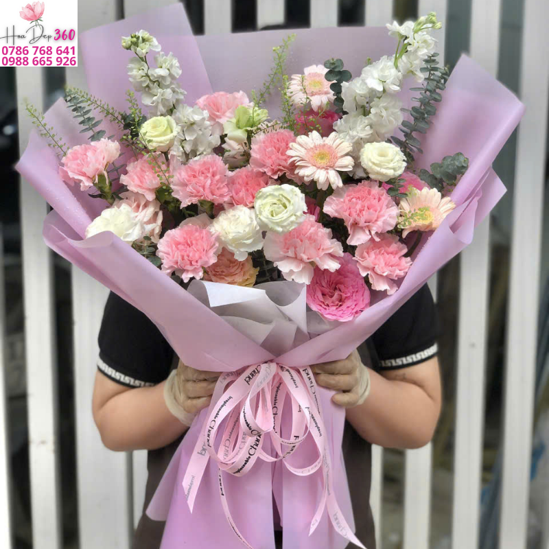 Bó hoa cẩm chướng hồng phối hoa hồng trắng và hoa đồng tiền pastel mang lại tổng thể nhẹ nhàng, ngọt ngào nhưng không kém phần sang trọng. Sắc hồng tượng trưng cho sự lãng mạn, yêu thương; trong khi sắc trắng lại gợi sự tinh khôi, trang nhã.