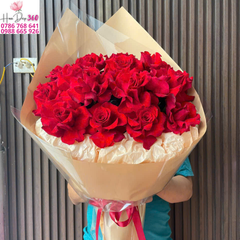 Bó hoa hồng đỏ full sang trọng với sắc đỏ rực rỡ, gói giấy kraft nâu thanh lịch, mang đến tổng thể vừa hiện đại vừa lãng mạn. Hoa hồng đỏ luôn là biểu tượng bất diệt của tình yêu cháy bỏng, sự đam mê và lời tỏ tình ngọt ngào.