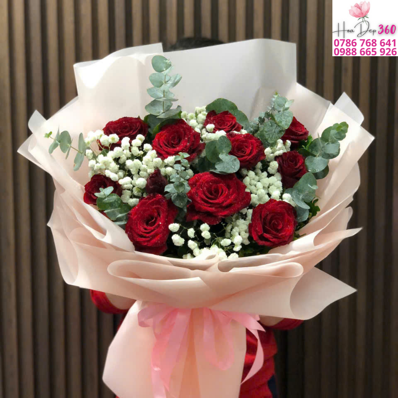 Bó hoa kết hợp hoa hồng đỏ rực rỡ cùng baby trắng tinh khôi và điểm xuyết lá xanh eucalyptus, tạo nên một tổng thể vừa sang trọng, lãng mạn vừa tinh tế, thanh lịch.