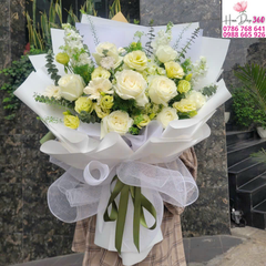Bó hoa được thiết kế từ hoa hồng trắng tinh khôi, kết hợp cùng hoa cẩm tú cầu xanh nhạt, cúc mẫu đơn trắng và lá bạc eucalyptus. Tất cả được gói trong lớp giấy trắng thanh lịch, nhấn bằng nơ ruy băng xanh lá sang trọng, tạo nên tổng thể trang nhã, hiện đại và đầy tinh tế.