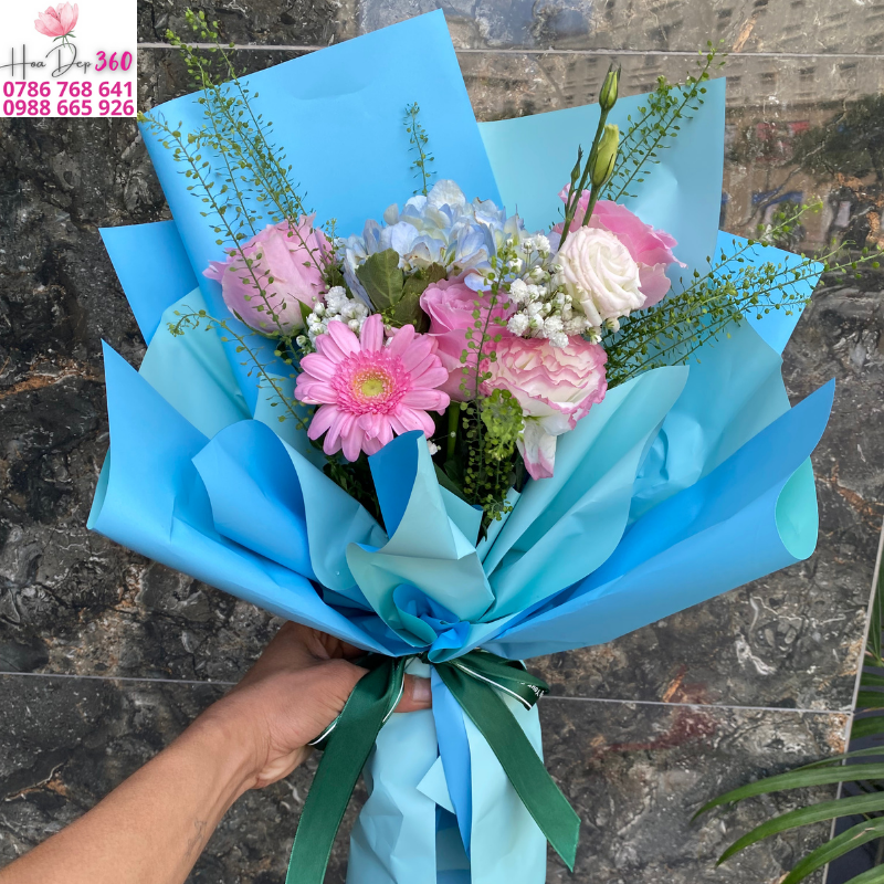 Bó hoa được kết hợp tinh tế từ hoa hồng pastel, hoa đồng tiền hồng, baby trắng, cẩm tú cầu xanh nhạt và hoa lá phụ xanh, tạo nên một tổng thể ngọt ngào, thanh thoát và vô cùng hiện đại.