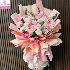 Bó hoa cực kỳ nổi bật nhờ sự kết hợp hài hoà giữa gam màu trắng ngà – hồng pastel – hồng phấn, tạo nên một tổng thể nhẹ nhàng nhưng vẫn ấn tượng, chắc chắn sẽ làm người nhận say đắm ngay từ cái nhìn đầu tiên.
