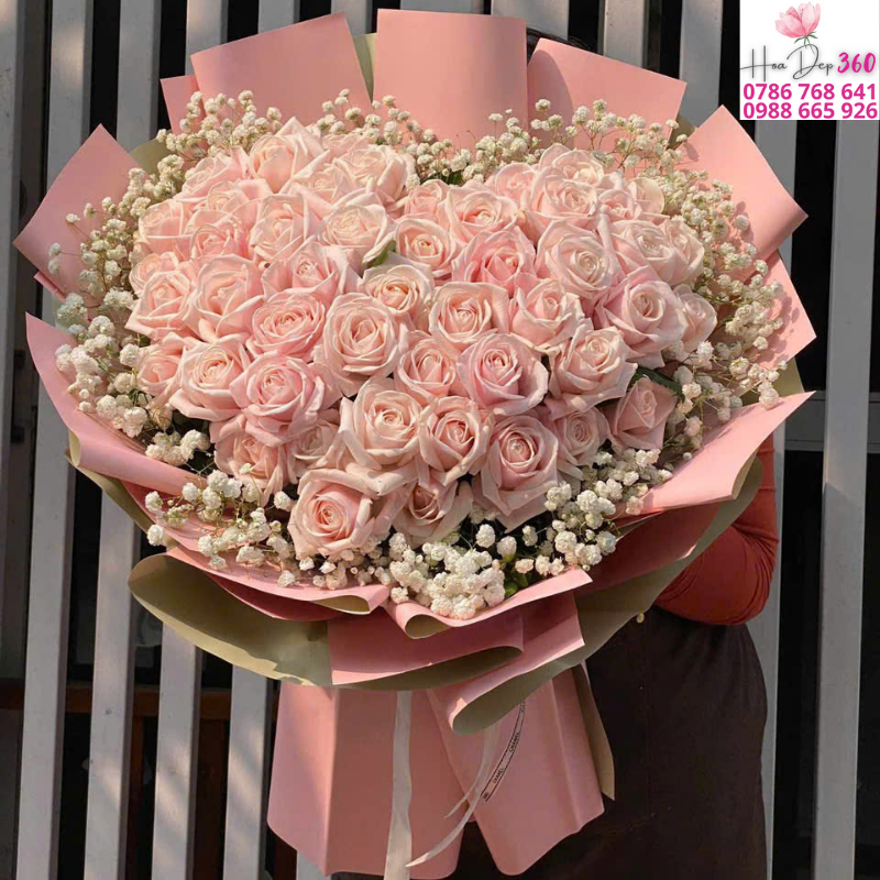 Bó hoa được thiết kế độc đáo với hình trái tim, kết hợp từ hàng chục bông hoa hồng phấn mềm mại cùng những nhánh baby trắng tinh khôi. Đây là mẫu hoa cao cấp, sang trọng và lãng mạn, lý tưởng để bày tỏ tình yêu thương sâu đậm.