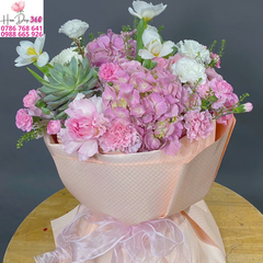 Bó hoa được kết hợp tinh tế từ cẩm tú cầu hồng, hoa cẩm chướng, hoa tulip trắng, hoa hồng trắng và đặc biệt có điểm nhấn từ sen đá xanh. Sự phối hợp độc đáo này tạo nên một tổng thể vừa mềm mại, lãng mạn nhưng vẫn mang nét hiện đại, mới lạ.