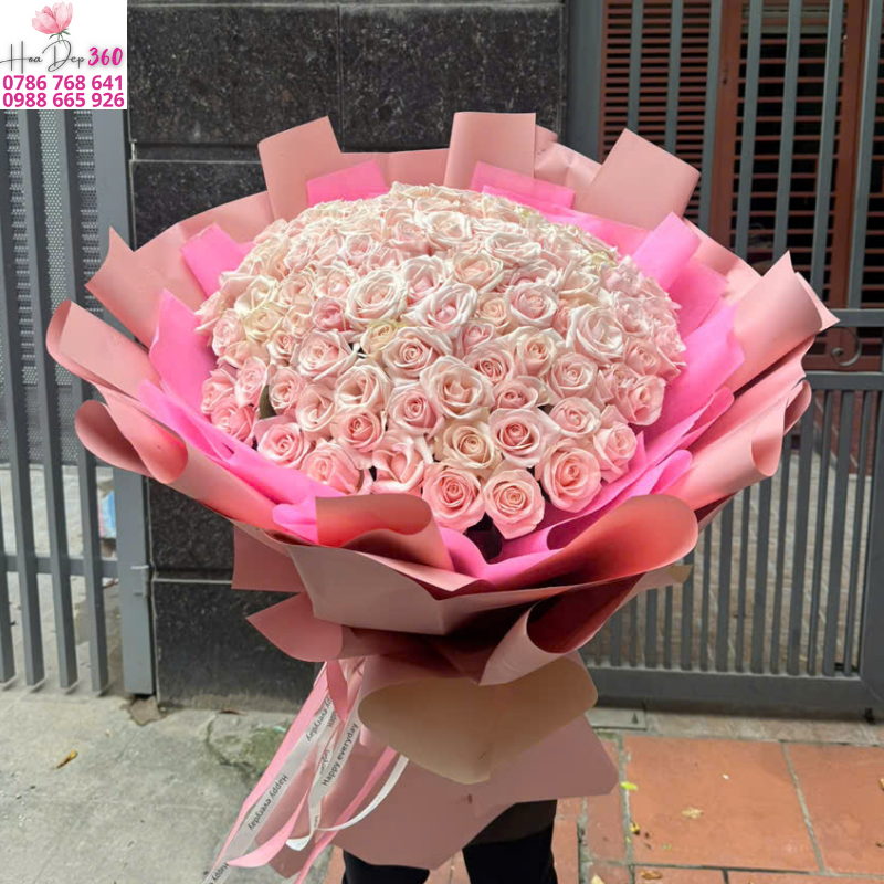 Bó hoa được kết từ hàng trăm bông hồng pastel cao cấp, được phối khéo léo với giấy gói tông hồng nhạt – hồng đậm, tạo nên một tổng thể sang trọng, lãng mạn và vô cùng ấn tượng.