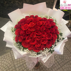 Bó hoa được kết hợp từ hơn 50 bông hồng đỏ rực rỡ xen kẽ cùng hoa baby trắng tinh khôi, được gói trong lớp giấy trắng sang trọng. Tổng thể mang đến vẻ đẹp lãng mạn, ngọt ngào và đẳng cấp.