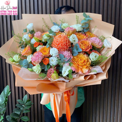 Bó hoa được thiết kế đầy tinh tế với sự hòa quyện của hoa hồng vàng – cam rực rỡ, mẫu đơn hồng pastel, cát tường trắng cùng điểm nhấn đặc biệt từ cúc mẫu đơn cam. Lá eucalyptus xanh mát giúp cân bằng tổng thể, tạo nên một bó hoa vừa sang trọng vừa tươi trẻ.