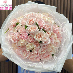 Bó hoa được thiết kế từ những đóa hoa hồng phấn pastel mềm mại, kết hợp cùng lớp giấy trắng thanh lịch và đường viền ngọc trai tinh tế. Tổng thể mang đến cảm giác sang trọng, dịu dàng nhưng vẫn vô cùng nổi bật.