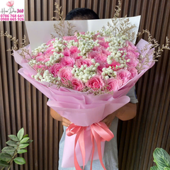 Bó hoa hồng hồng mix baby trắng được kết hợp từ những bông hồng hồng tươi thắm, xen lẫn baby trắng tinh khôi và lá trang trí nhẹ nhàng. Tông màu hồng pastel dịu dàng hòa quyện cùng sắc trắng trong trẻo tạo nên tổng thể ngọt ngào, lãng mạn và sang trọng.