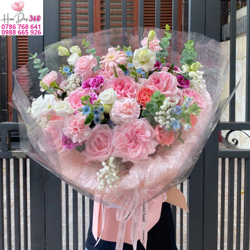 Bó hoa mix pastel được kết hợp khéo léo từ nhiều loại hoa cao cấp: hồng pastel dịu dàng, cẩm chướng xinh xắn, hoa baby trắng tinh khôi, đồng tiền hồng nhẹ nhàng cùng điểm nhấn xanh lam độc đáo. Mỗi sắc hoa mang một ý nghĩa riêng, khi kết hợp lại tạo nên bó hoa đầy màu sắc nhưng vẫn thanh lịch, hiện đại.