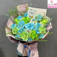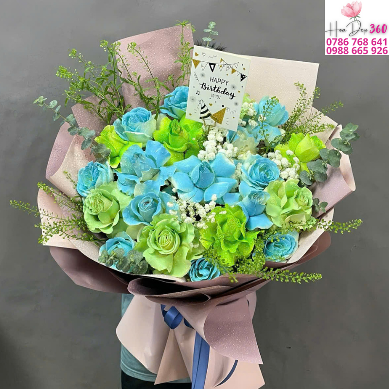 Bó hoa hồng xanh phối cùng hoa hồng xanh lá và điểm xuyết hoa trắng nhỏ mang đến tổng thể độc đáo, tươi mát và hiện đại. Sự kết hợp giữa hai gam màu xanh – biểu tượng của niềm tin, hy vọng và sức sống – tạo nên một bó hoa nổi bật, mới lạ và tràn đầy năng lượng tích cực. Đây là món quà tuyệt vời để dành tặng trong sinh nhật, khai trương, lễ kỷ niệm hoặc dịp đặc biệt.