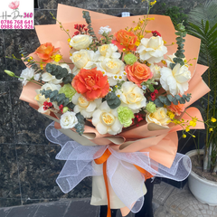 Bó hoa hồng cam phối cùng hoa hồng trắng tinh khôi, điểm xuyết lá xanh eucalyptus và hoa phụ tạo nên tổng thể tươi sáng, thanh lịch và sang trọng. Sắc cam rực rỡ tượng trưng cho niềm vui, năng lượng tích cực và sự hạnh phúc, trong khi sắc trắng tinh tế lại gợi sự thanh khiết, trang nhã. Đây là lựa chọn lý tưởng để dành tặng trong các dịp sinh nhật, khai trương, kỷ niệm, lễ tốt nghiệp hoặc chúc mừng thành công.