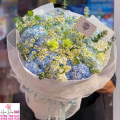 Bó hoa cẩm tú cầu xanh – xanh dương kết hợp cùng cúc họa mi trắng nhỏ xinh và hoa phụ tạo nên tổng thể nhẹ nhàng, thanh khiết và đầy tươi mát. Màu xanh dịu dàng của cẩm tú cầu tượng trưng cho hy vọng, sự bình yên và niềm tin vững bền, trong khi cúc họa mi gợi sự giản dị, tinh khôi và hạnh phúc trọn vẹn. Đây là món quà hoàn hảo để dành tặng trong sinh nhật, kỷ niệm, lễ tốt nghiệp, khai trương hay dịp chúc mừng thành công.