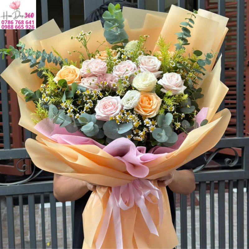 Bó hoa hồng pastel nhiều màu (hồng nhạt, cam đào, trắng sữa) phối hợp cùng cúc họa mi trắng nhỏ xinh, điểm thêm lá bạc hà xanh mát, được gói trong giấy vàng cam trang nhã. Sự kết hợp này mang đến tổng thể hài hòa, tươi sáng, vừa dịu dàng vừa sang trọng. Đây là lựa chọn hoàn hảo để dành tặng trong sinh nhật, kỷ niệm, lễ tình yêu, 8/3, 20/10, lễ tốt nghiệp hoặc các dịp chúc mừng thành công.