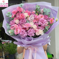 Bó hoa hồng tím mix hồng pastel kết hợp cùng các loài hoa phụ nhỏ xinh và lá bạc hà xanh mát, được gói trong giấy tím trang nhã, mang đến tổng thể vừa lãng mạn vừa sang trọng. Sắc tím tượng trưng cho tình yêu thủy chung, sự cao quý, trong khi hồng pastel lại gợi sự ngọt ngào, tinh khôi và đầy lãng mạn. Đây là món quà hoàn hảo để dành tặng trong Valentine, sinh nhật, lễ kỷ niệm, ngày 8/3, 20/10 hoặc dịp chúc mừng đặc biệt.