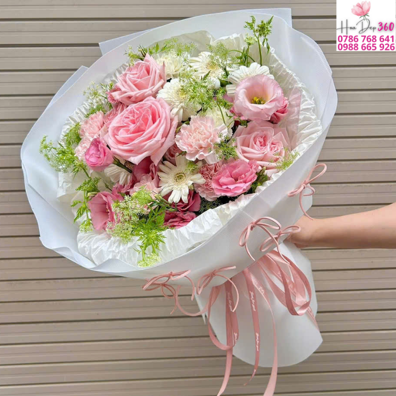 Bó hoa hồng hồng pastel phối cùng hoa trắng tinh khôi mang đến vẻ đẹp dịu dàng, sang trọng và đầy cảm xúc. Gam màu hồng tượng trưng cho tình yêu ngọt ngào, sự quan tâm và lòng biết ơn, trong khi hoa trắng lại gợi lên sự thuần khiết, thanh lịch và tinh tế.
