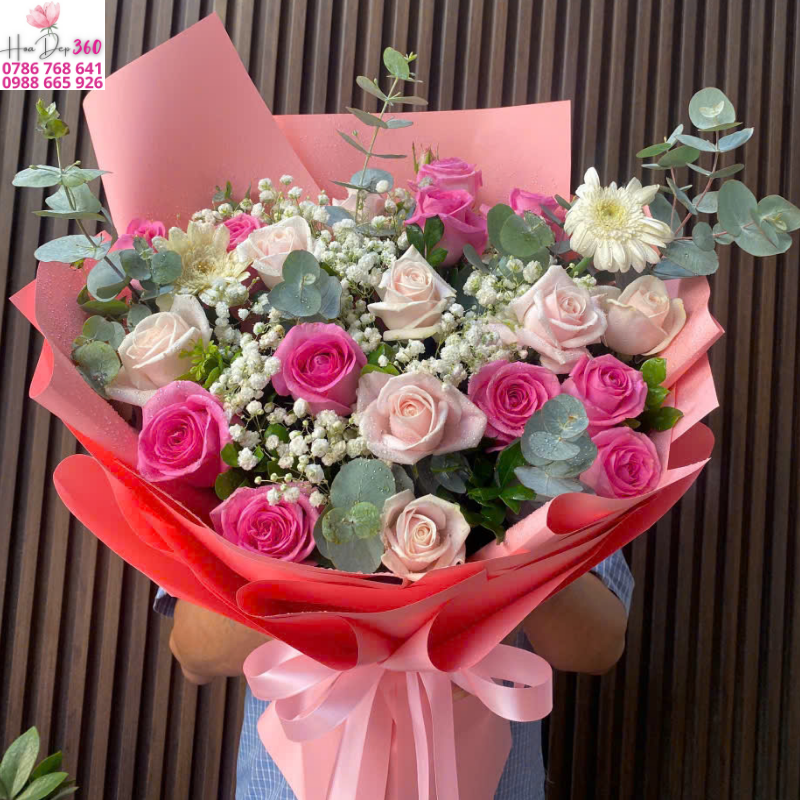 Bó hoa hồng hồng đậm kết hợp hồng pastel cùng hoa baby breath trắng tinh khôi và lá bạc xanh mát, tạo nên tổng thể sang trọng, lãng mạn và đầy cuốn hút. Màu hồng đậm tượng trưng cho tình yêu nồng nhiệt, trong khi hồng pastel mang lại cảm giác dịu dàng, ngọt ngào. Sắc trắng của baby breath giúp bó hoa thêm phần thanh thoát, tinh tế.