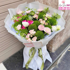 Bó hoa được phối hợp độc đáo giữa cỏ nở xanh tròn cùng hoa hồng pastel nhẹ nhàng và hoa cẩm chướng hồng – trắng tinh khôi, tạo nên tổng thể vừa hiện đại, vừa tươi mới và tràn đầy sức sống.