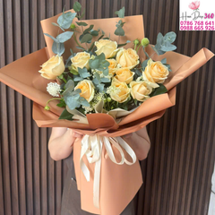 Bó hoa hồng vàng đồng rực rỡ, kết hợp cùng lá bạc eucalyptus xanh mát, được gói trong lớp giấy cam đất tinh tế, mang đến tổng thể ấm áp, sang trọng và cuốn hút.