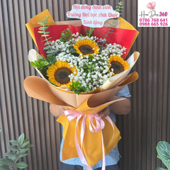 Bó hoa được thiết kế rực rỡ với hoa hướng dương vàng tươi – biểu tượng của niềm tin và hy vọng, kết hợp cùng baby breath trắng tinh khôi và lá xanh eucalyptus thanh mát. Tất cả được gói trong giấy vàng – đỏ nổi bật, thắt nơ hồng dịu dàng, tạo nên tổng thể vừa sang trọng vừa trẻ trung.