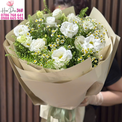 Bó hoa được kết hợp tinh tế giữa hoa hồng trắng, hoa cát tường trắng xen kẽ cùng cúc họa mi trắng – vàng nhỏ xinh và lá xanh điểm xuyết. Tổng thể mang đến vẻ đẹp tinh khôi, thanh lịch và đầy trang nhã.