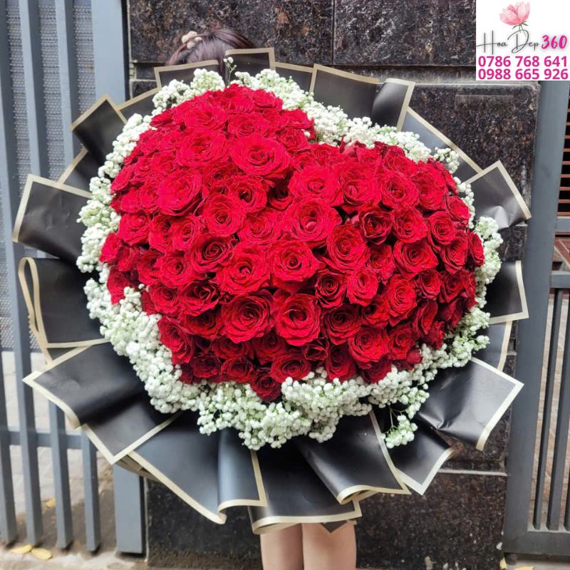 Tại Hoa Đẹp 360, bó hoa trái tim được thiết kế thủ công, sử dụng hoa hồng tươi 100% và giấy gói sang trọng, mang đến sự ấn tượng ngay từ cái nhìn đầu tiên.
