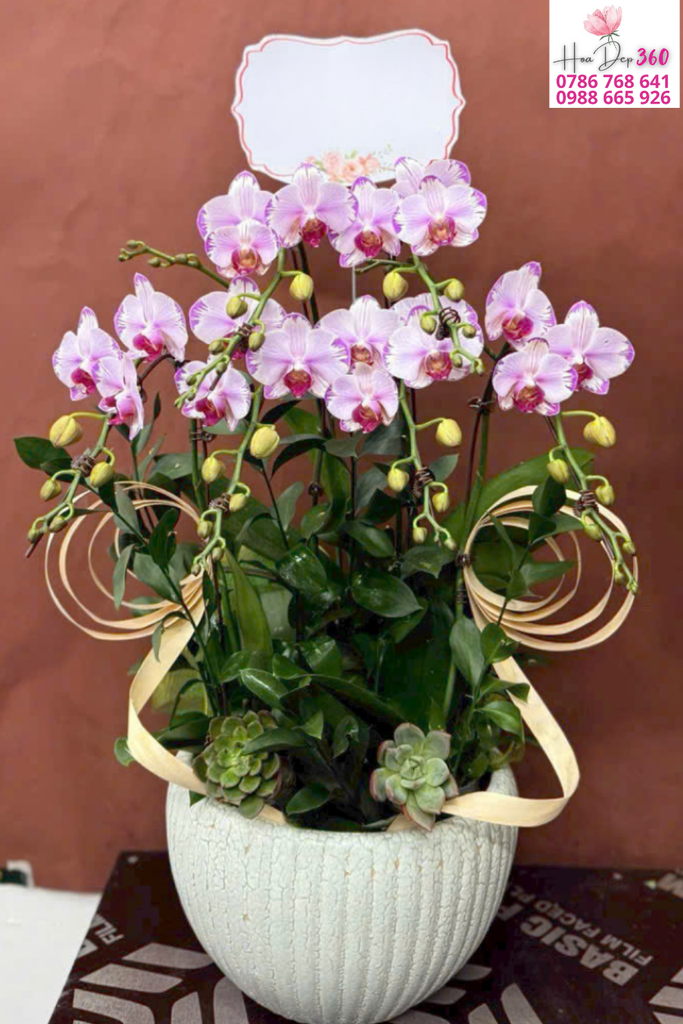 Phối hoa:Nhiều cành lan nở đều, xen kẽ nụ non xanh khỏe, bố cục tỏa tròn cân đối, tạo cảm giác đầy đặn và hài hòa.