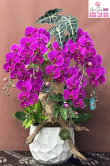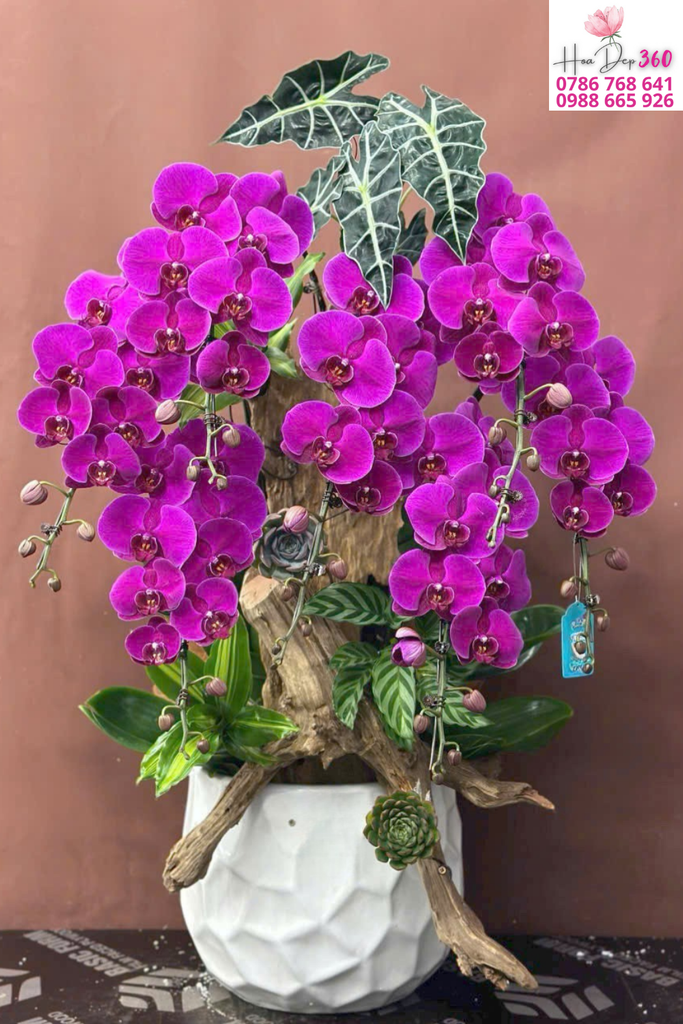 Hoa chủ đạo: Lan hồ điệp tím đậm, cánh tròn đều, sắc hoa tươi thắm; họng hoa ánh vàng – nâu tạo chiều sâu và điểm nhấn nổi bật.