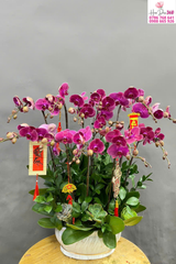 Hoa chủ đạo:Lan hồ điệp tím đậm sang trọng, cánh hoa dày, sắc tím nổi bật, họng hoa ánh vàng tạo điểm nhấn cuốn hút.