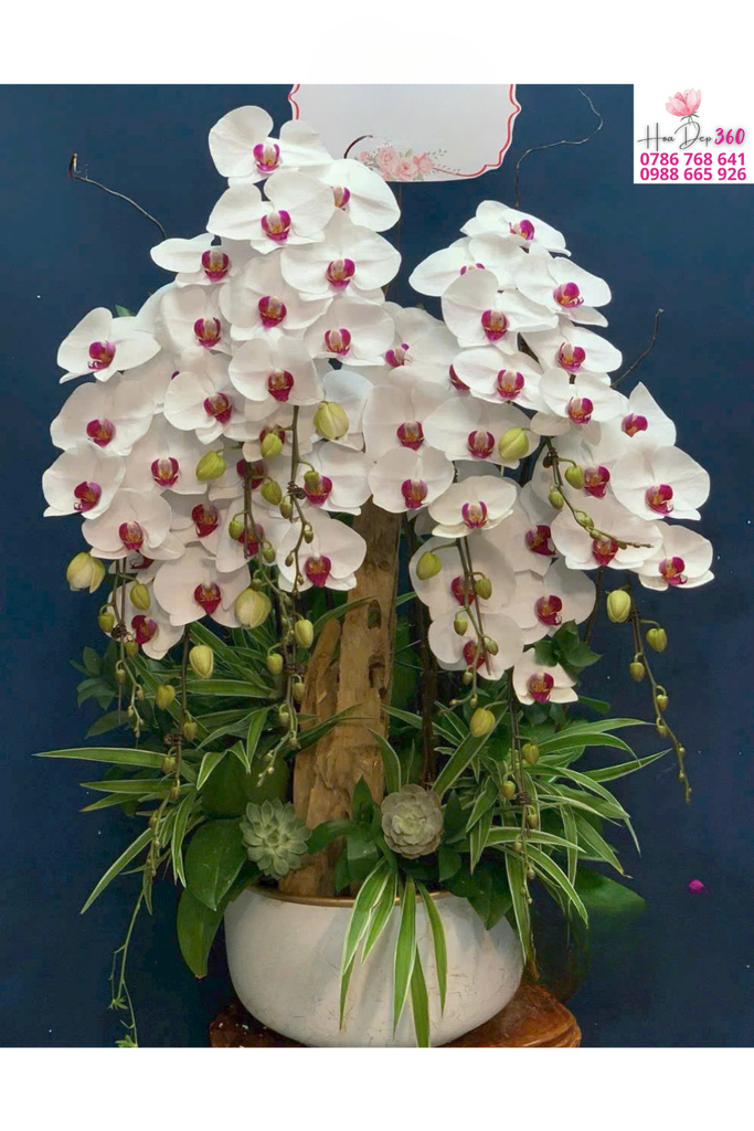 Hoa chủ đạo: Lan hồ điệp trắng, cánh hoa tròn đều, dày mịn; họng hồng tím nổi bật tạo điểm nhấn tinh tế và cuốn hút.