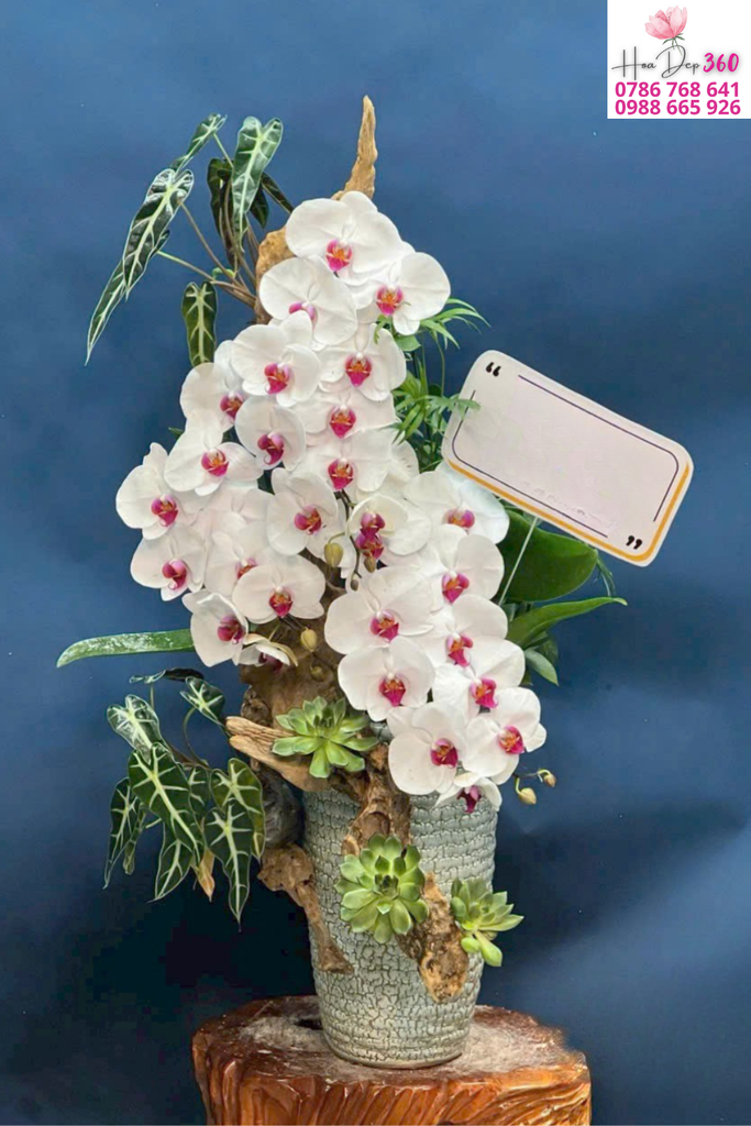 Hoa chủ đạo:Lan hồ điệp trắng tinh tế, cánh hoa tròn dày, họng hồng đậm nổi bật, mang vẻ đẹp sang trọng và cuốn hút.
