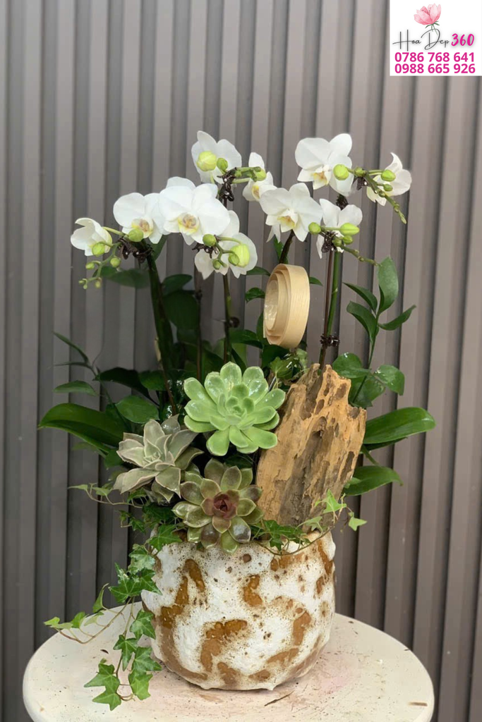 Phối hoa:Nhiều cành lan nở đều, xen kẽ nụ xanh khỏe mạnh, kết hợp các loại sen đá và dây leo xanh, tạo bố cục hài hòa và giàu sức sống.