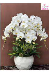 Hoa chủ đạo: Chậu gồm nhiều cành lan hồ điệp trắng với cánh hoa tròn, mềm mại và thanh thoát. Gam trắng tinh khôi mang đến cảm giác sang trọng và thuần khiết.
