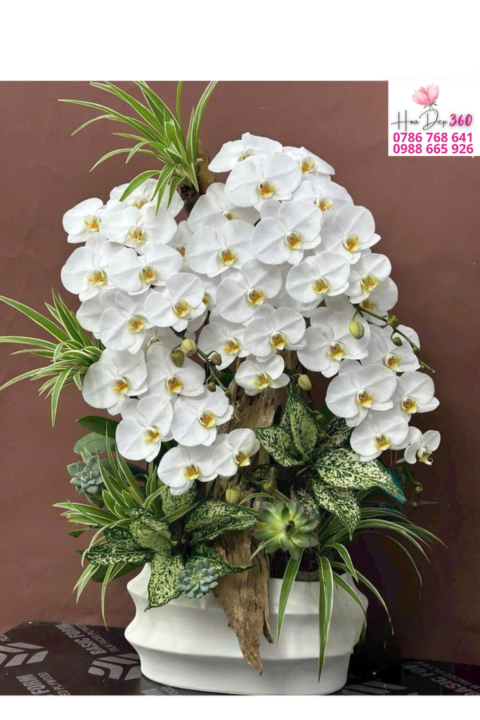 Hoa chủ đạo: Lan hồ điệp trắng tinh khôi, cánh tròn dày, họng vàng nhẹ tạo điểm nhấn thanh lịch và sang trọng.