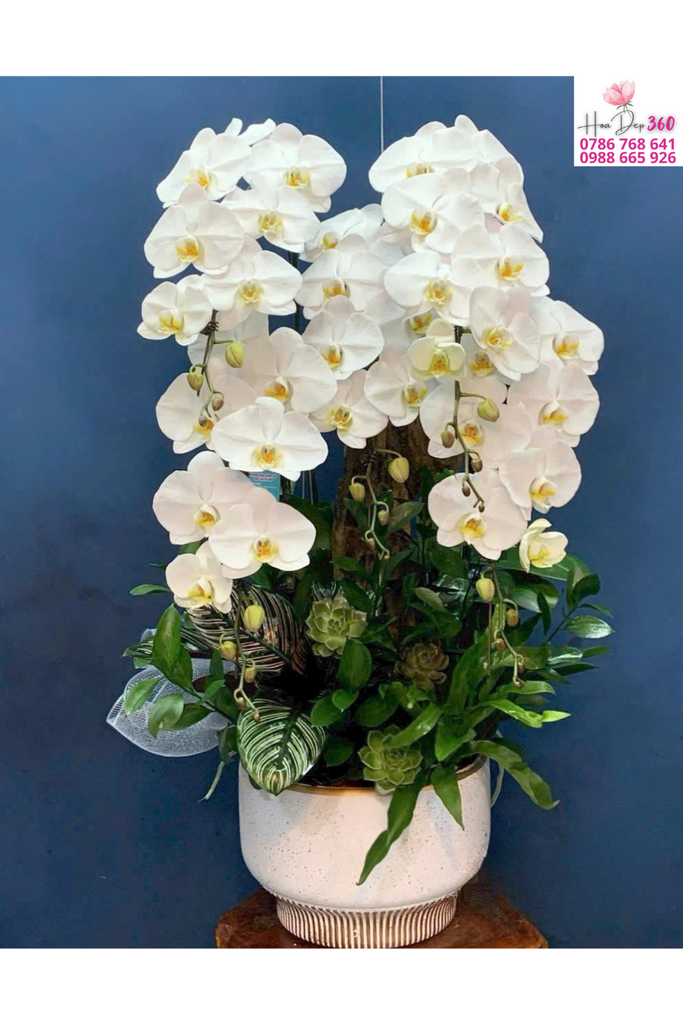 Phối hoa:Nhiều cành lan nở rộ, đan xen nụ xanh buông mềm tự nhiên, tạo bố cục tỏa tròn hài hòa, đầy đặn và cân đối.