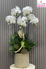 Hoa chủ đạo:Lan hồ điệp trắng tinh khôi, cánh hoa to tròn, bề mặt mịn màng, họng hoa vàng nhạt dịu nhẹ, mang vẻ đẹp thanh lịch và cao cấp.