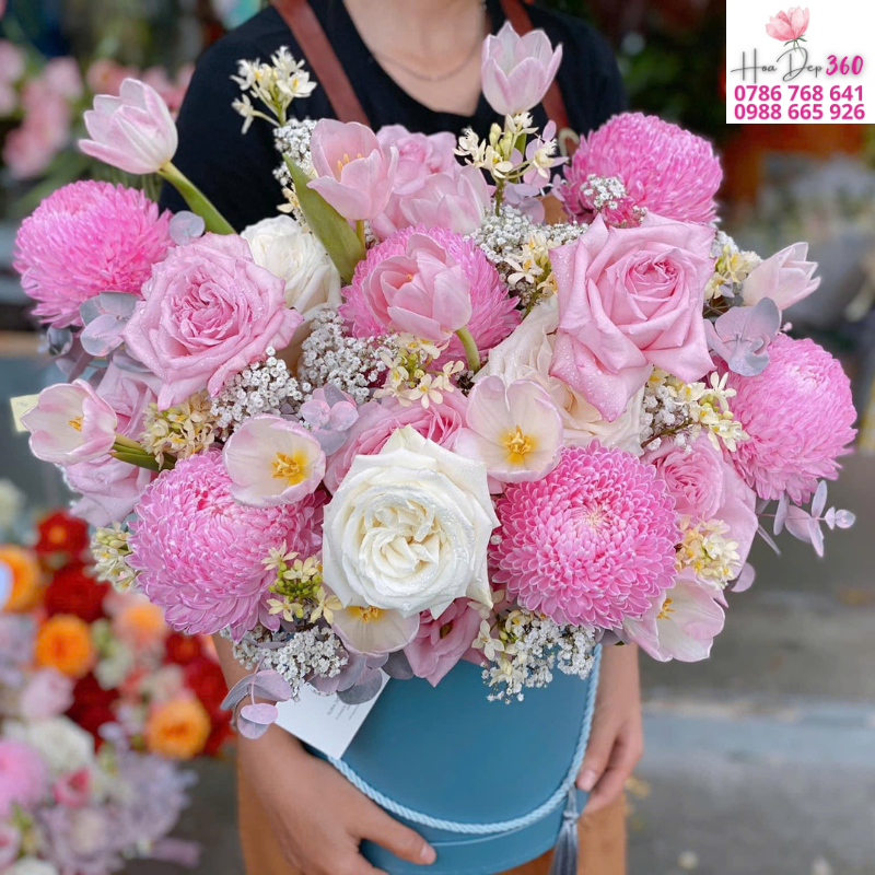 Giỏ hoa chúc mừng sang trọng được thiết kế tinh tế từ những bông hoa hồng O’Hara cao cấp, kết hợp cùng cúc mẫu đơn hồng mềm mại, điểm xuyết hoa tulip thanh lịch và nhiều loài hoa phụ khác. Sự hòa quyện giữa sắc hồng ngọt ngào và trắng tinh khôi mang đến thông điệp về tình yêu, sự may mắn và niềm vui trọn vẹn.