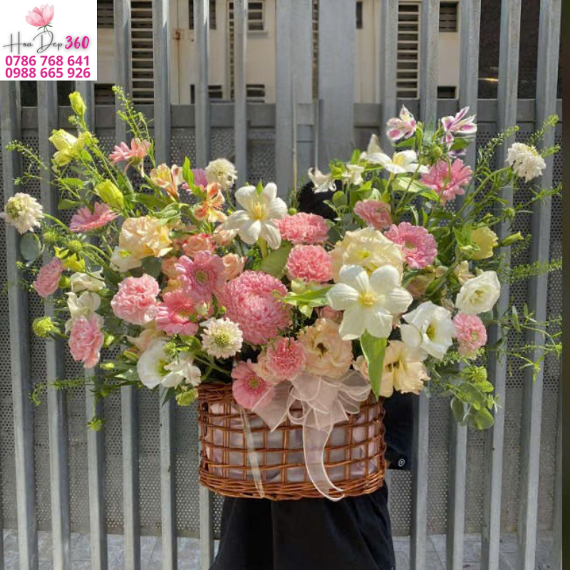 Hoa được sử dụng bao gồm hoa cẩm chướng hồng, hoa đồng tiền pastel, hoa lan tường trắng, hoa thanh tú, cúc mẫu đơn và các loại lá phụ như lá bạc, lá nhám… Tất cả đều là hoa tươi loại 1, được cắt tỉa và phối màu kỹ lưỡng, đảm bảo độ bền và giữ form lâu. Giỏ hoa phù hợp làm quà tặng sinh nhật, chúc mừng khai trương, kỷ niệm, gửi lời yêu thương hoặc động viên tinh thần người thân, bạn bè, đối tác.