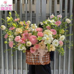 lựa chọn hoàn hảo cho những ai yêu thích vẻ đẹp nhẹ nhàng, trong trẻo. Với tông màu hồng phấn chủ đạo kết hợp cùng trắng ngà và xanh lá dịu mát, giỏ hoa mang đến cảm giác an yên, thư giãn và đầy nữ tính. Thiết kế giỏ hoa tròn bằng mây tre đan, điểm xuyết ruy băng mềm mại, tạo nên tổng thể vừa hiện đại vừa gần gũi, phù hợp với nhiều không gian và sự kiện.