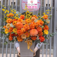Lẵng hoa tươi chúc mừng là món quà sang trọng, ý nghĩa và đầy tinh tế, được thiết kế từ những loài hoa cao cấp như hoa hồng cam, hoa đồng tiền vàng, hoa cúc mẫu đơn, baby trắng kết hợp cùng lá xanh tươi mát. Sự phối hợp màu sắc rực rỡ giữa cam – vàng – trắng không chỉ mang lại cảm giác ấm áp, hạnh phúc mà còn tượng trưng cho sự thành công, may mắn và tri thức rạng ngời.