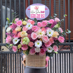 Được thiết kế trong giỏ mây tre đan sang trọng, giỏ hoa vừa mang nét hiện đại vừa gần gũi, phù hợp làm quà tặng trong nhiều dịp đặc biệt như sinh nhật, kỷ niệm, khai trương, lễ cưới, lễ tình nhân, 20/10, 8/3 hay Ngày của Mẹ. Với sự pha trộn tinh tế giữa những gam màu hồng ngọt ngào, trắng tinh khôi và tím pastel lãng mạn, giỏ hoa là món quà tuyệt vời để gửi gắm thông điệp yêu thương, lòng biết ơn, lời chúc may mắn và hạnh phúc đến người nhận.