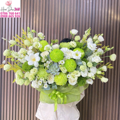 Giỏ hoa tươi phối sắc trắng – xanh thanh lịch là sự kết hợp hoàn hảo giữa vẻ đẹp tinh khôi và sự tươi mát. Với hoa hồng trắng, hoa cát tường trắng, hoa lily, hoa cúc ping pong xanh, hoa lan cùng lá phụ eucalyptus, giỏ hoa mang đến một tổng thể sang trọng, hiện đại nhưng không kém phần nhẹ nhàng, thanh thoát. Gam màu chủ đạo trắng – xanh tượng trưng cho sự khởi đầu mới, niềm tin, may mắn và thịnh vượng, rất phù hợp để làm quà tặng trong nhiều dịp đặc biệt.